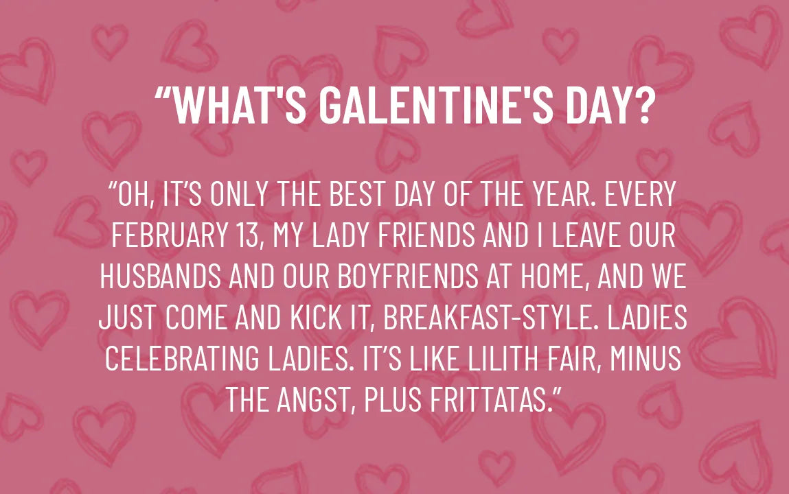 “Oh, it’s only the best day of the year. Every February 13, my lady friends and I leave our husbands and our boyfriends at home, and we just come and kick it, breakfast-style. Ladies celebrating ladies. It’s like Lilith Fair, minus the angst, Plus frittatas.”